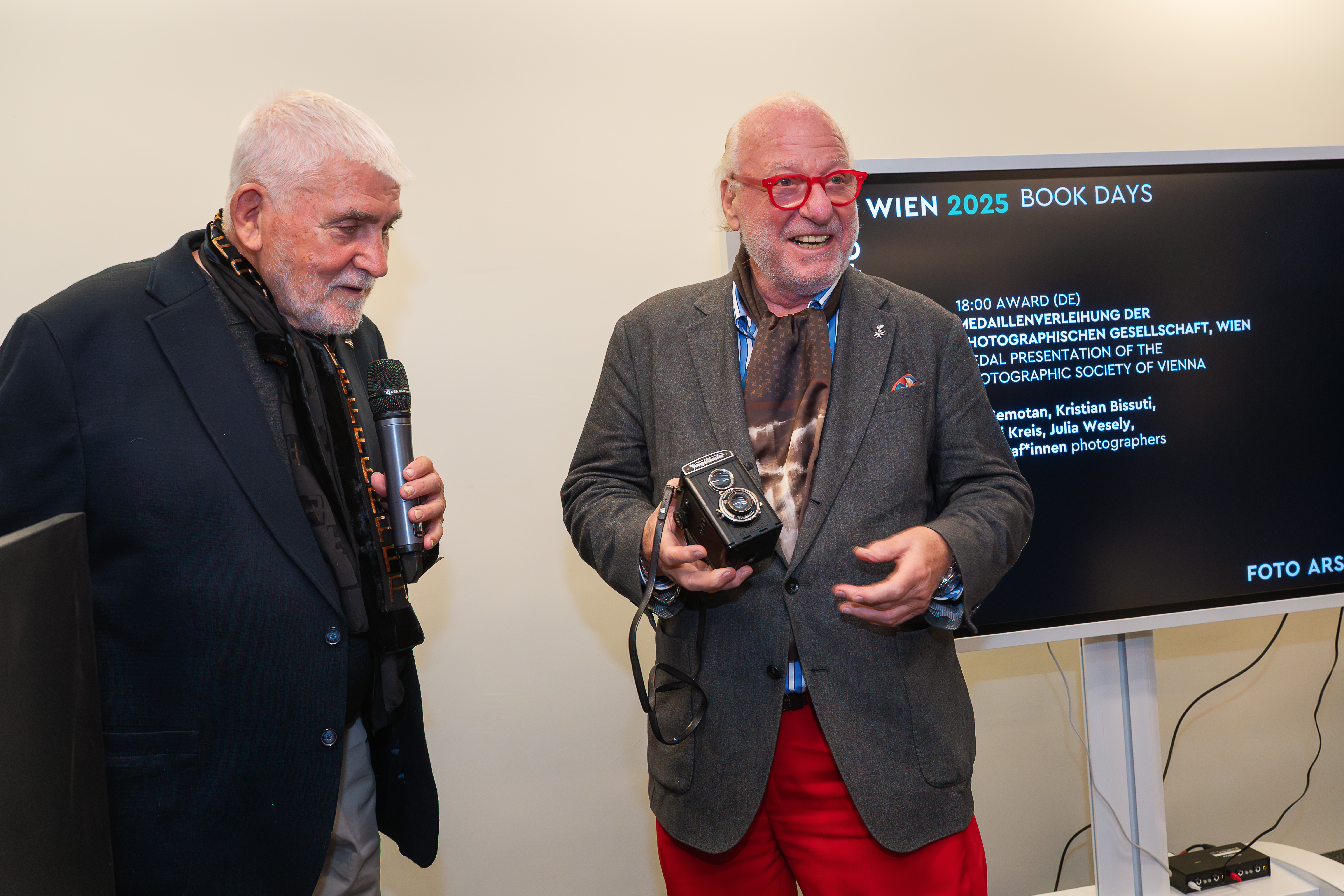 - Prof. Kristian Bissuti, der Toppressefotograf in Österreich erhielt für seine Verdienste die GOLDENE VOIGTLÄNDERMEDAILLE. Prof. Dr. Werner Sobotka, der Präsident der PhG hielt die Laudatio und überreichte die Medaille.